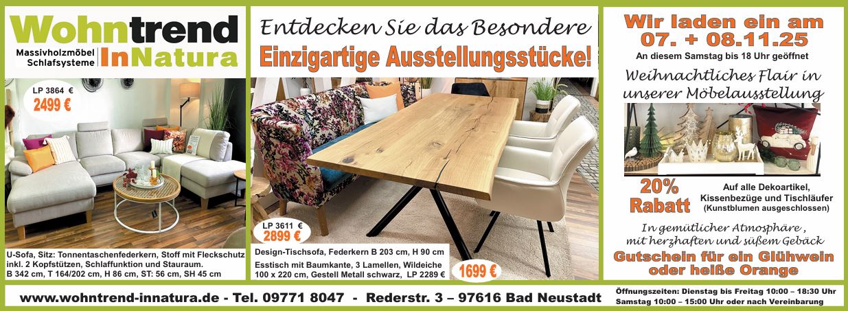 Entdeckt am 07. und 08.11.2025 unsere einzigartigen Ausstellungsstücke, stimmt euch auf Weihnachten ein und sichert euch 20 % Rabatt auf alle Dekoartikel, Kissenbezüge und Tischläufer — inklusive Gutschein für ein warmes Getränk.